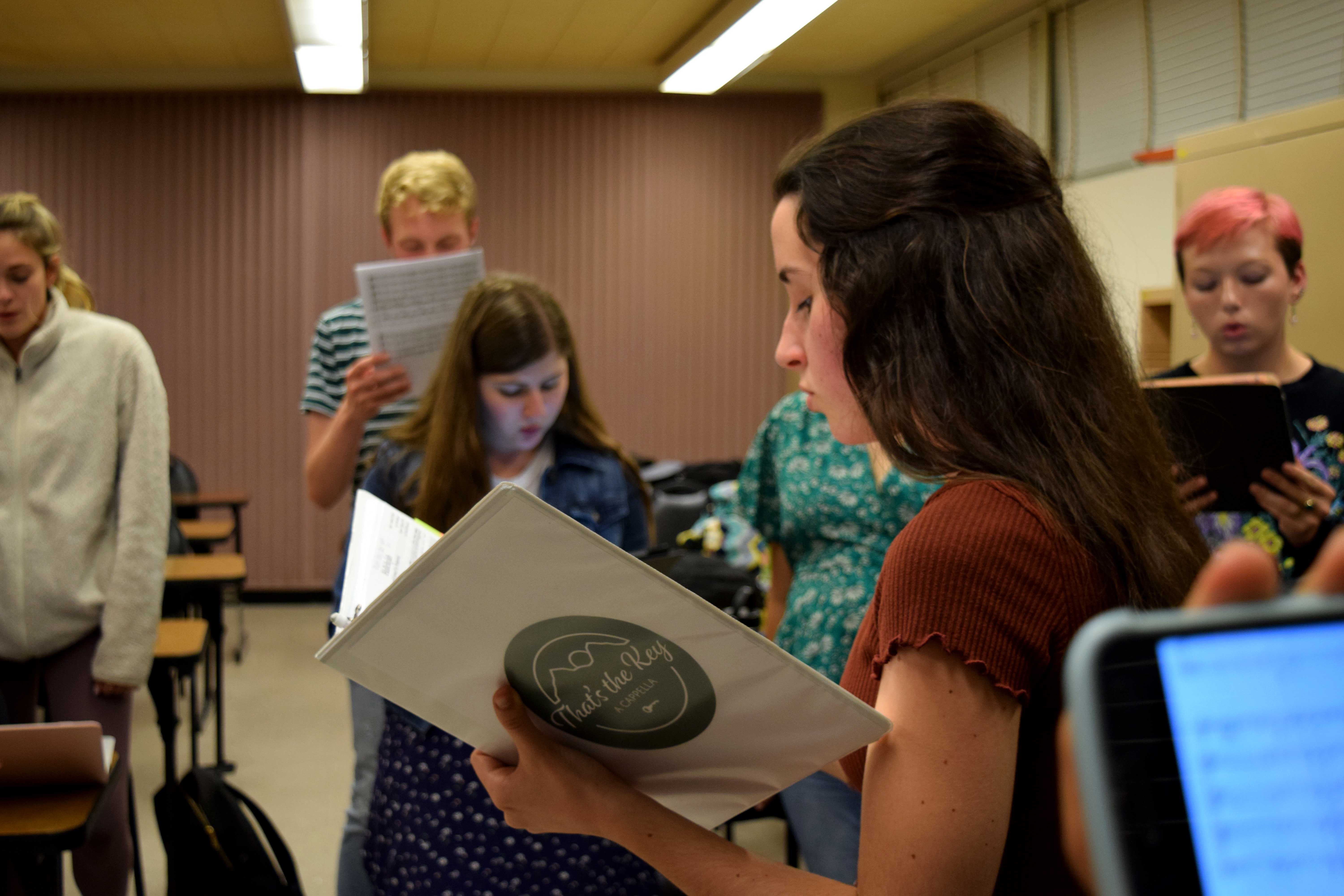 Music director Shane Williamson and group member Ashley Marckel search their sheet music for dynamic markings.