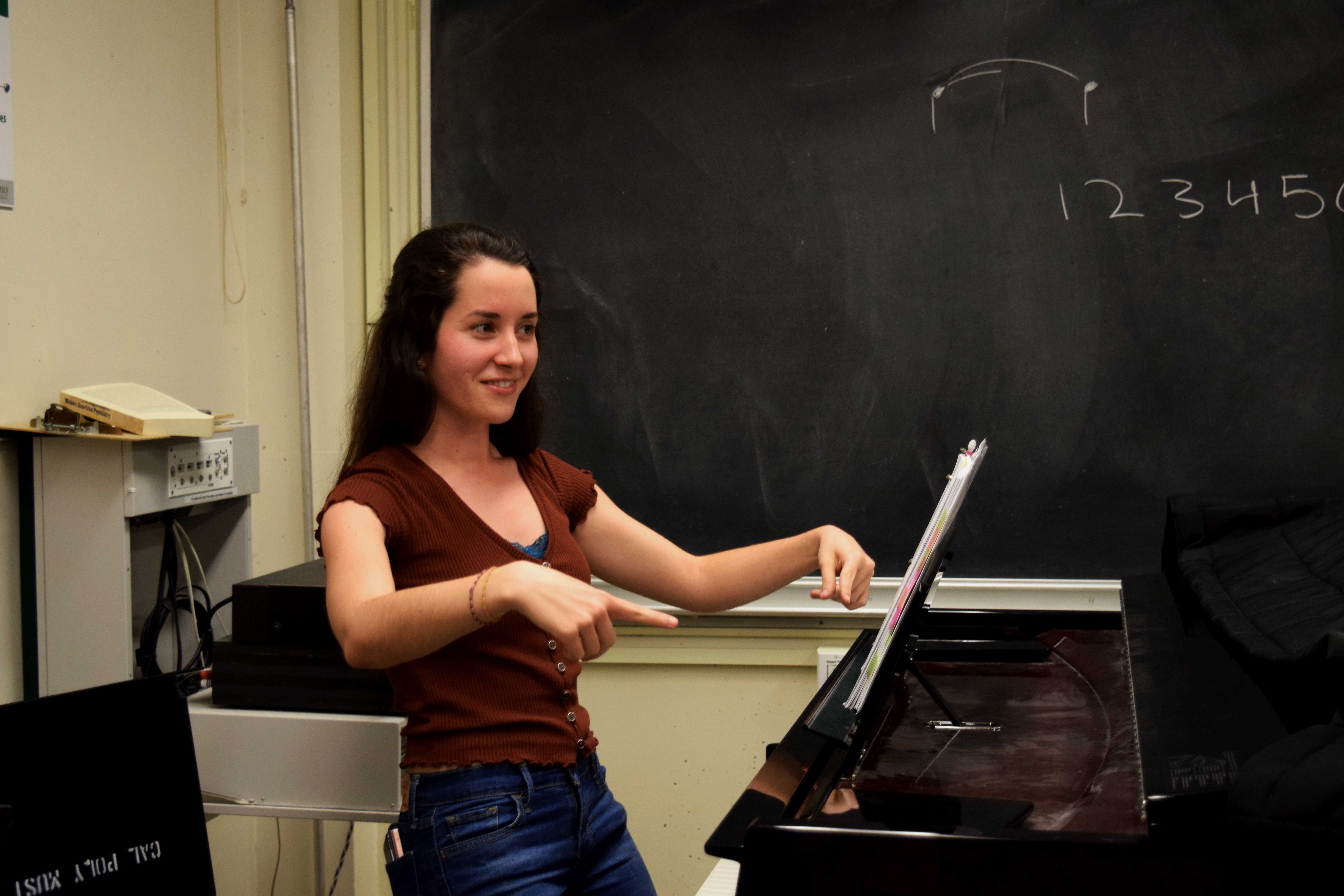 Capella, substituting for her acapella group’s music director, began rehearsal by leading warm ups. Capella is thrilled to be a part of acapella. “TTK is my why,” Capella said. “Why I came to Cal Poly, and why I’m here.”